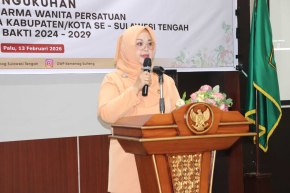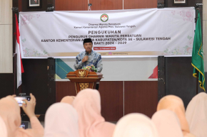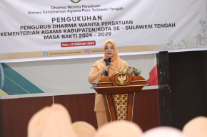 Ketua DWP Kanwil Kemenag Sulteng Ibu Sandra, mengukuhkan pengurus DWP Kemenag Kab/Kota secara luring dan daring. Turut hadir dalam pengukuhan Kakanwil Kemenag Sulteng. di Aula Kanwil, Jumat, 13/2/2026.