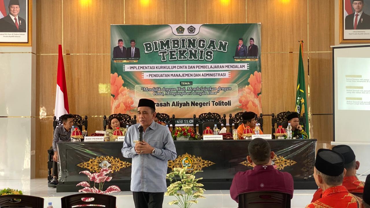 Tolitoli (Kemenag Sulteng) - Implementasi Kurikulum Cinta sangat penting sebagai upaya membangun madrasah yang tidak hanya mencerdaskan tetapi juga menumbuhkan nilai kemanusiaan, cinta, dan empati. Hal tersebut ditegaskan Kepala Kantor Kementerian Agama (Kakankemenag) Kabupaten Tolitoli, Makmur Muhammad Arief, dalam kegiatan Bimbingan Teknis (Bimtek) Implementasi Kurikulum Cinta dan Pembelajaran Mendalam serta Bimtek Penguatan Manajemen dan Administrasi di Aula MAN Tolitoli, Kamis (9/10/2025).