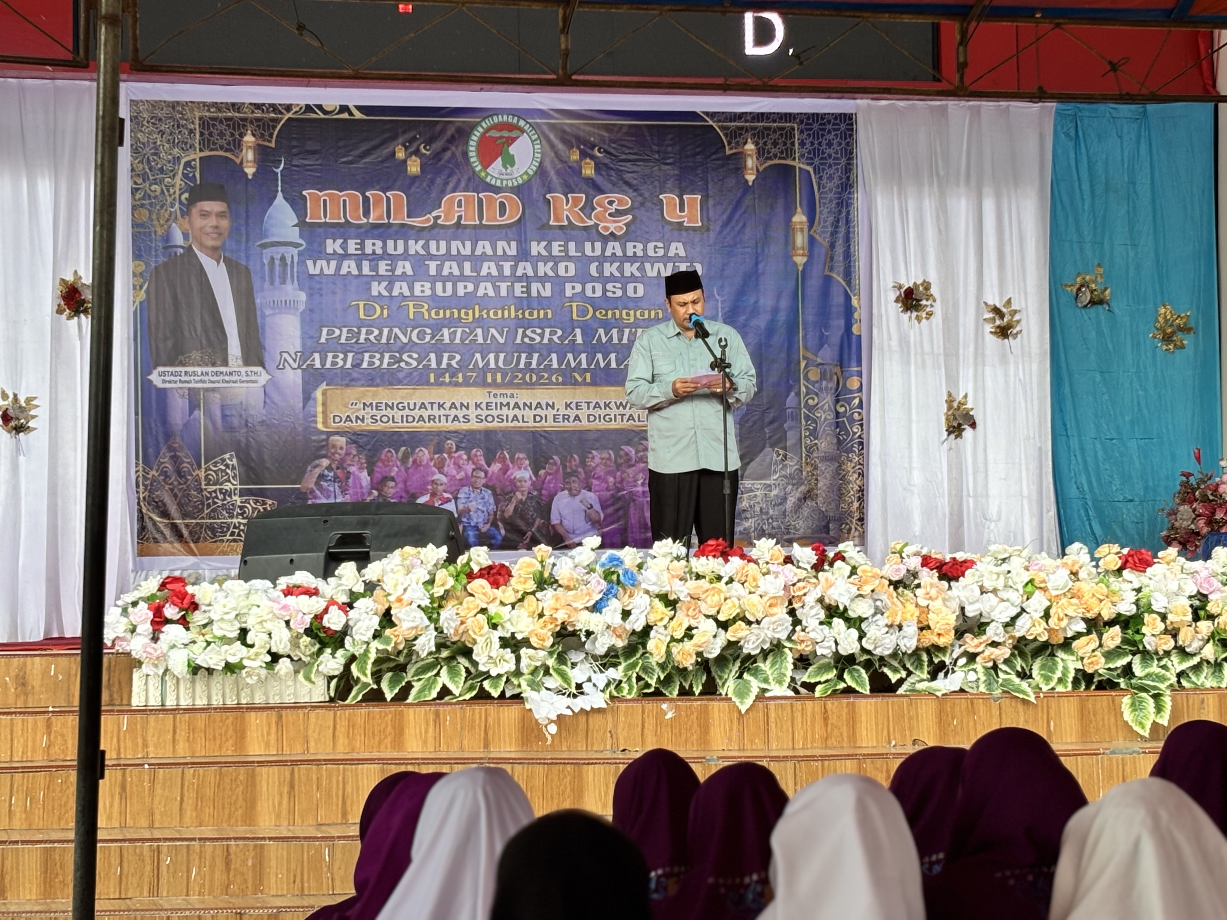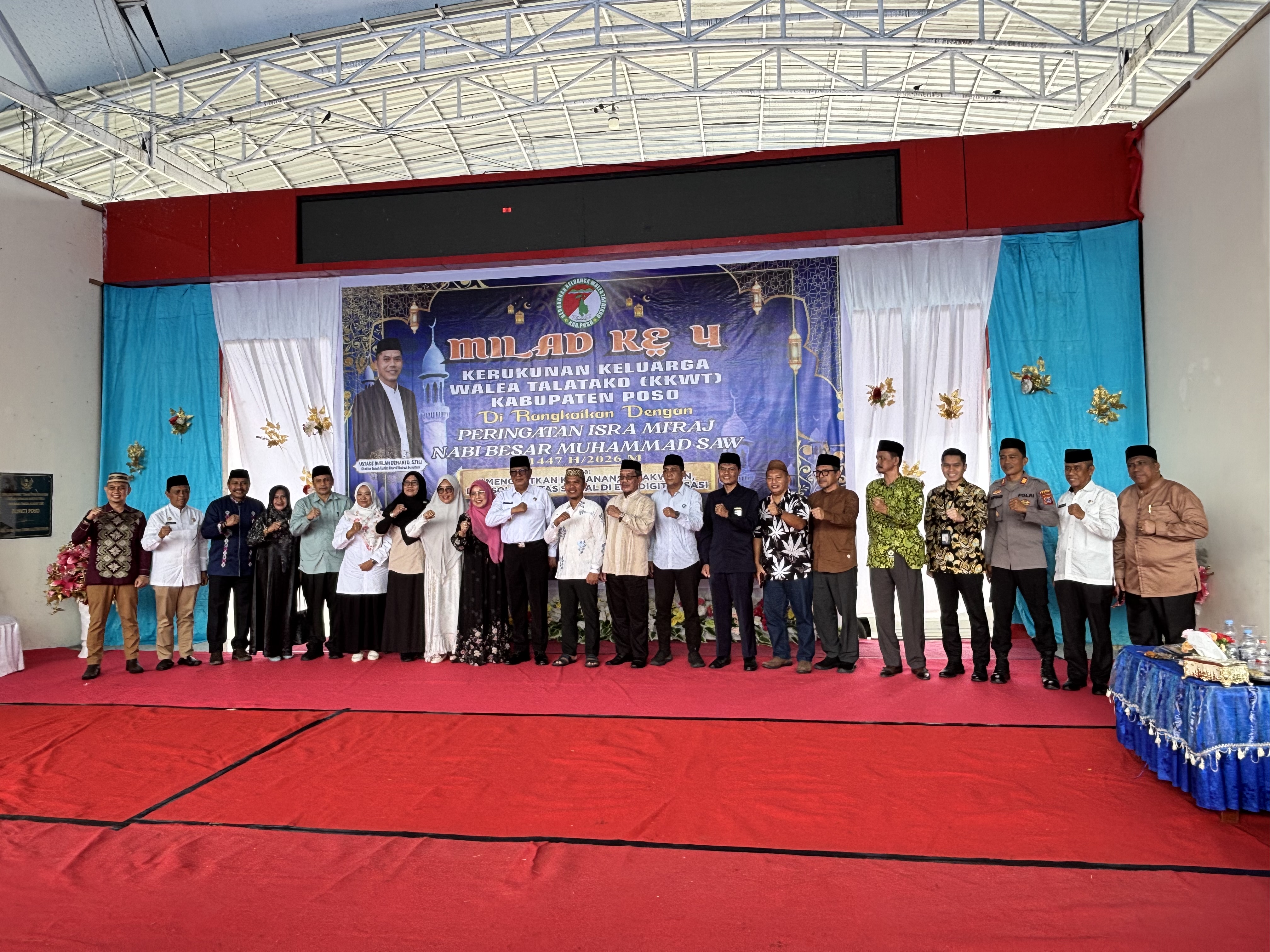 Poso (Kemenag Sulteng) — Kepala Kantor Kementerian Agama Kabupaten Poso, Sutami M. Idris, menghadiri sekaligus memimpin doa dalam kegiatan Milad ke-4 Kerukunan Keluarga Walae Talatako (KKWT) Kabupaten Poso yang dirangkaikan dengan Peringatan Isra Mi’raj Nabi Besar Muhammad SAW 1447 H/2026 M. Kegiatan tersebut berlangsung meriah di Lapangan Sintuwu Maroso Poso, Rabu (21/01/2026).