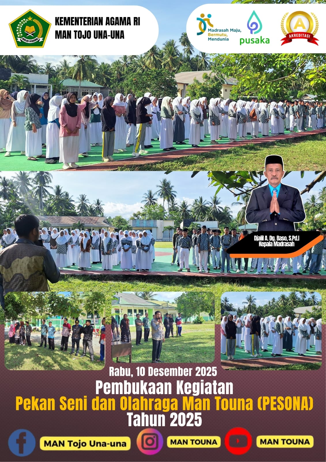 Tojo Una-Una, 10 Desember 2025 — Madrasah Aliyah Negeri (MAN) Tojo Una-Una resmi membuka kegiatan Pekan Seni dan Olahraga (PESONA) Tahun 2025 pada Rabu pagi. Acara yang berlangsung di halaman madrasah ini diikuti oleh seluruh siswa.