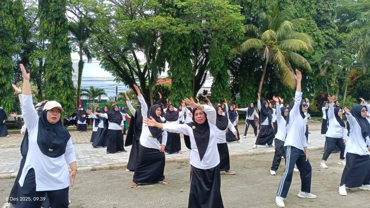 Ket: Dra. Hj. Marwiah, M.Si Kepala Kemenag Morowali, turut mengikuti Senam Kebugaran Jasmani (SKJ) pada pembukaan rangkaian HAB ke-80 di halaman Kantor Kemenag Morowali, Senin (8/12/25).