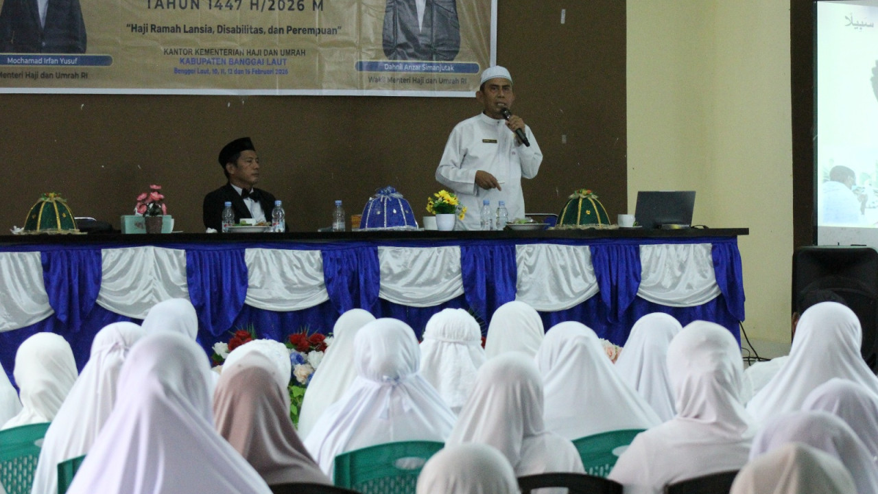 Banggai Laut (Kemenag Sulteng) – Kepala Kantor Kementerian Agama (Kakan Kemenag) Kabupaten Banggai Laut, H. Riatman A. Nursin, menjadi pemateri pada kegiatan Manasik Haji Tingkat Kabupaten Banggai Laut Tahun 1447 H/2026 M, bertempat di Aula BKPSDMD Banggai Laut, Kamis (12/02/2026).
