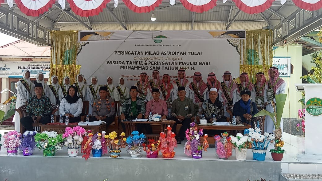 Hal ini disampaikan oleh Kepala Kantor Kementerian Agama kabupaten Parigi Moutong H As'at Latopada saat menghadiri acara Milad ke 20 As'Adiyah Tolai , Wisuda Tahfidz, dan Maulid Nabi Muhammad Shalallahu Alaihi Wasallam 1447 Hijriah, rabu 24 September 2025 di Pondok Pesantren Assadiyah Tolai.