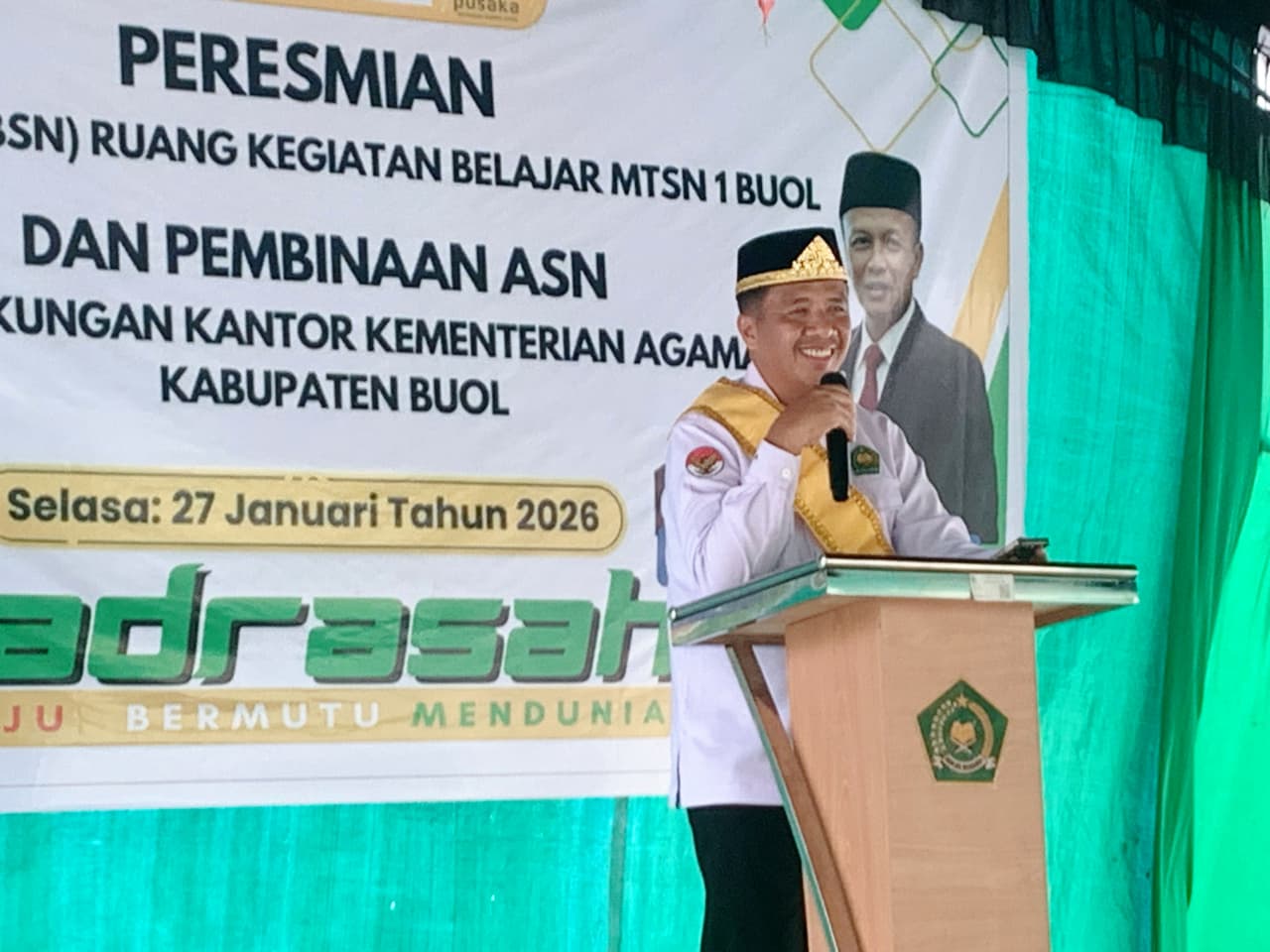 Buol (Kemenag Sulteng) – Aparatur Sipil Negara (ASN) Kementerian Agama (Kemenag) Kabupaten Buol diingatkan tentang tugas utama Kemenag terkait pelayanan dan pembinaan agama serta pendidikan agama dan keagamaan. Hal ini disampaikan Kepala Kantor Wilayah (Kakanwil) Kemenag Sulteng Junaidin, dalam kegiatan Pembinaan ASN di lingkungan Kemenag Buol yang digelar di Halaman MTsN 1 Buol, Selasa (27/1/2026).