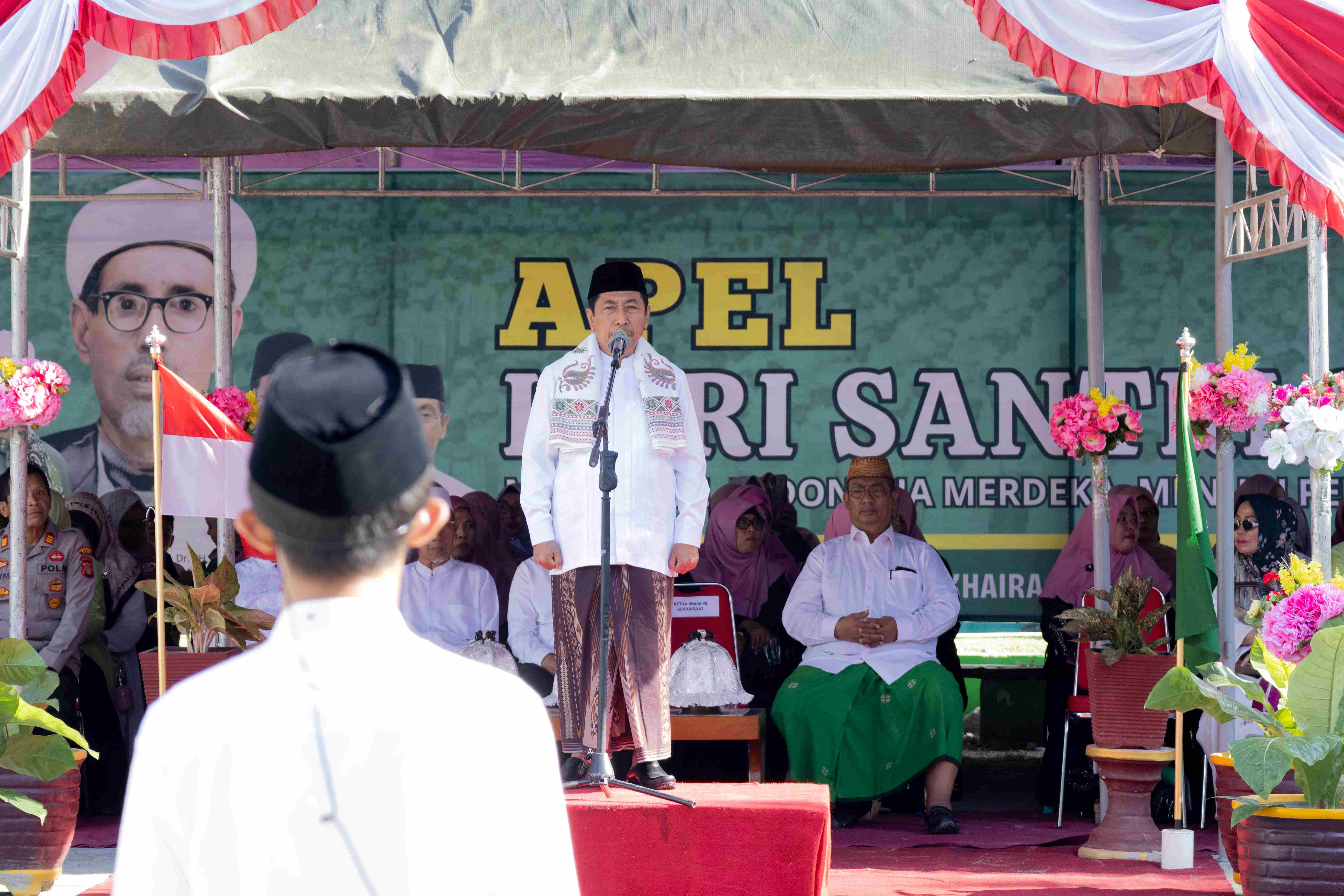 Ket: Dr. HS. Mohsen Alaydrus, MM, Ketua PB Alkhairaat, menyampaikan amanat kebangsaan sebagai Pembina Upacara dalam Apel Hari Santri Nasional 2025 Kota Palu di Lapangan Alkhairaat Pusat. (22/10/2025)
