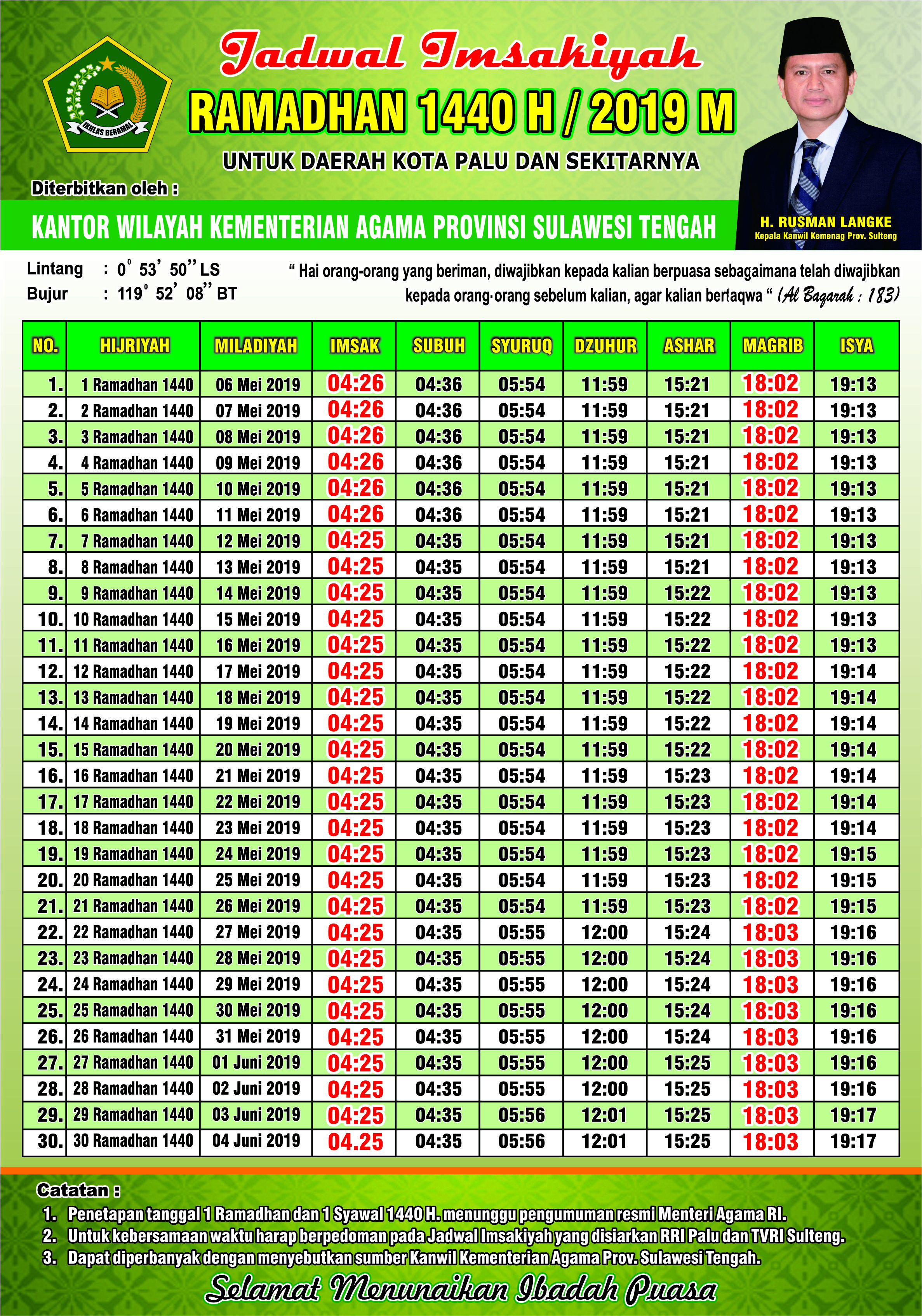 Jadwal Imsakiyah Ramadhan 1440 H / 2019 M Untuk Kota Palu dan Sekitarnya